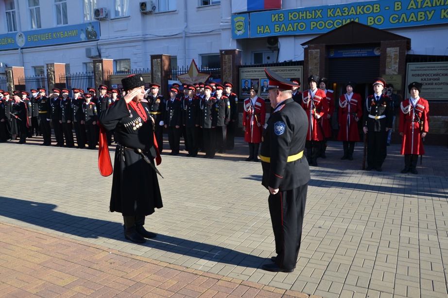 На торжественном построении новобранцы Новороссийского казачьего кадетского корпуса принимались в кадеты, участники Парада Победы получали медали, отличившимся кадетам и казакам Новороссийского РКО были вручены казачьи и краевые награды, благодарности и грамоты.