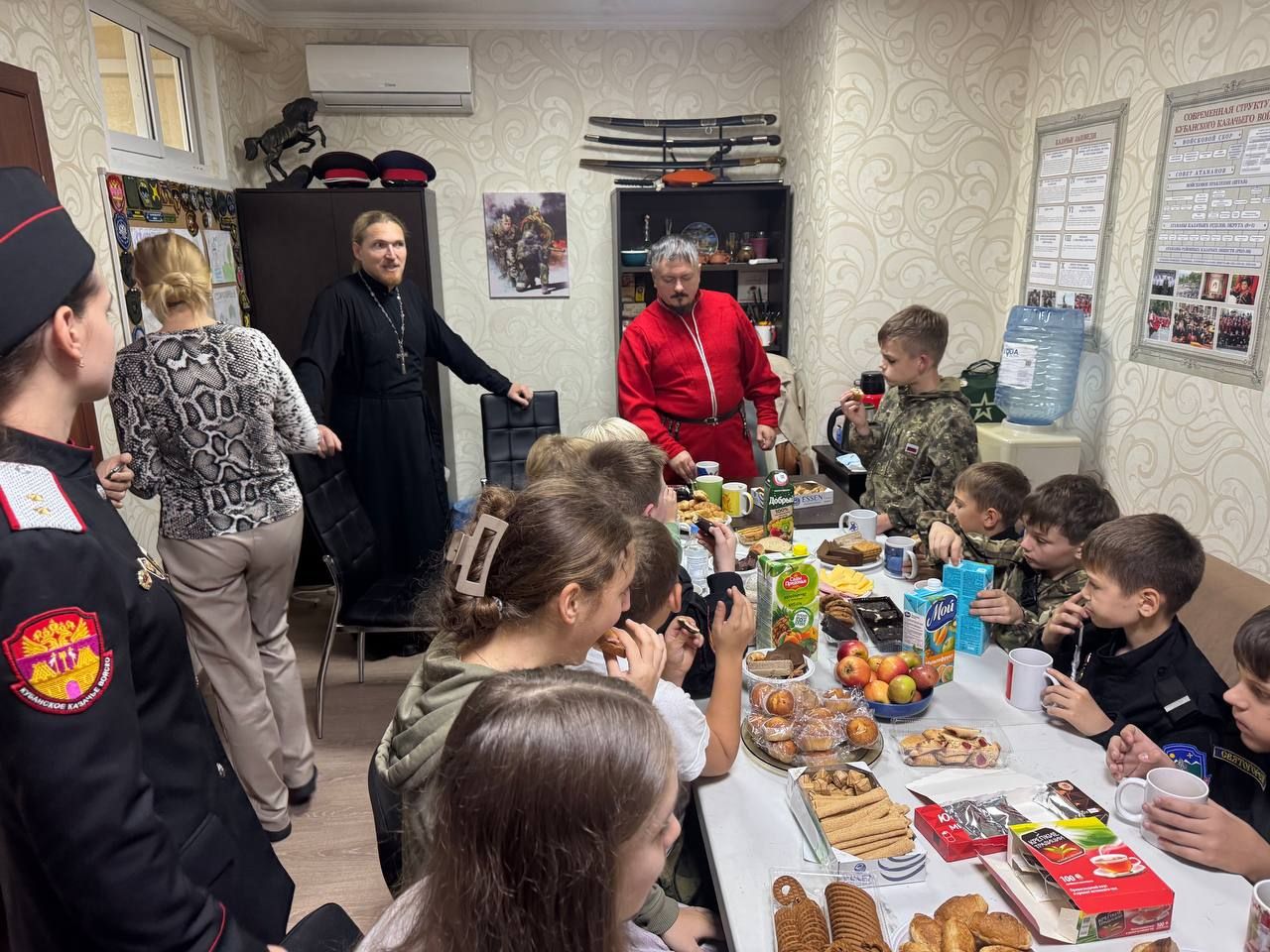 В день Архангела Михаила духовник казачьего военно-патриотического клуба «Святогорец» города Сочи, Отец Дмитрий Ходарин встретился с воспитанниками за праздничным столом. Он рассказал ребятам об Архангеле Михаиле, о том, как его подвиги отражены в Библии. Зашел разговор и жизни школьников.
