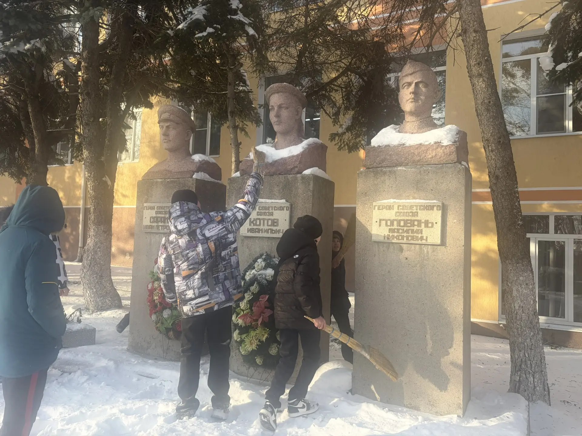 Волонтеры Победы привели в порядок пострадавшие от снежной стихии памятники на территории школы — памятник Трем Героям и Стеллу СВО.